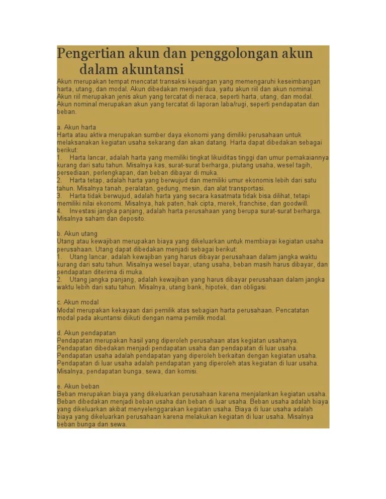 Akun nominal, yaitu kelompok akun yang memiliki nilai saldo bersifat sementara atau temporal. Penggolongan akun · akun riil (real account) adalah akun yang disajikan ke dalam neraca antara lain harta/aktiva, utang, dan modal. Setelah itu kita lanjut bahas penggolongan akun nominal . Akun nominal atau yang sering disebut dengan nominal account adalah kelompok akun yang ditulis transaksinya di dalam laporan . Akun riil terdiri dari tiga kelompok seperti harta, kewajiban, dan modal.